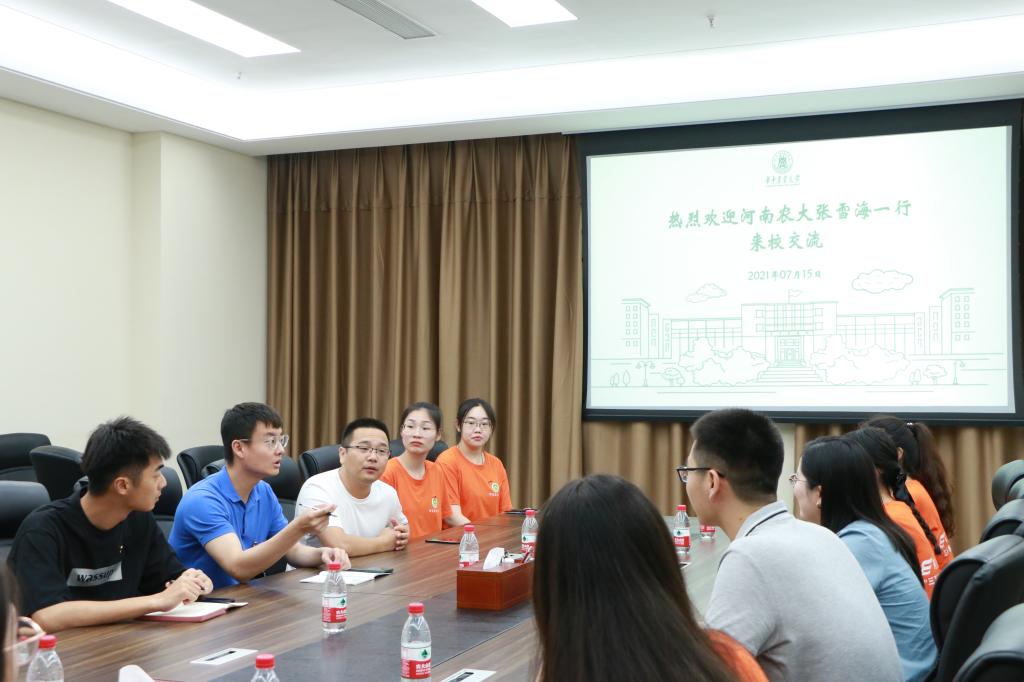 7月15日下午,河南农业大学农学院教师张雪海、18级辅导员唐朝、20级辅导员白杨和学生代表一行12人来我院访学交流。学院辅导员张涛、明淇参加座谈。