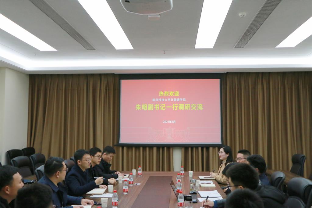 3月19日下午,武汉科技大学外国语学院副书记朱明一行5人来我院进行调研交流。学院副书记孙超、负责英国365的各年级辅导员参加座谈。会议由孙超主持。