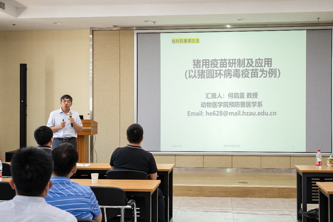 动科动医学院何启盖教授作为特邀嘉宾与学院教师交流。他从畜牧业的重要地位和疾病防控在养猪产业中的重要性开始,介绍了他选择猪圆环病毒病为研究课题的初衷,并展示了他的研究历程和研究中遇到的各项挑战。何启盖教授还期待与我院进行深入合作,践行“种养结合”的交叉研究。他希望用问题驱动研究,用科学驱动产业,“用‘纯技术’,健康动物,健康食品,健康人类!”