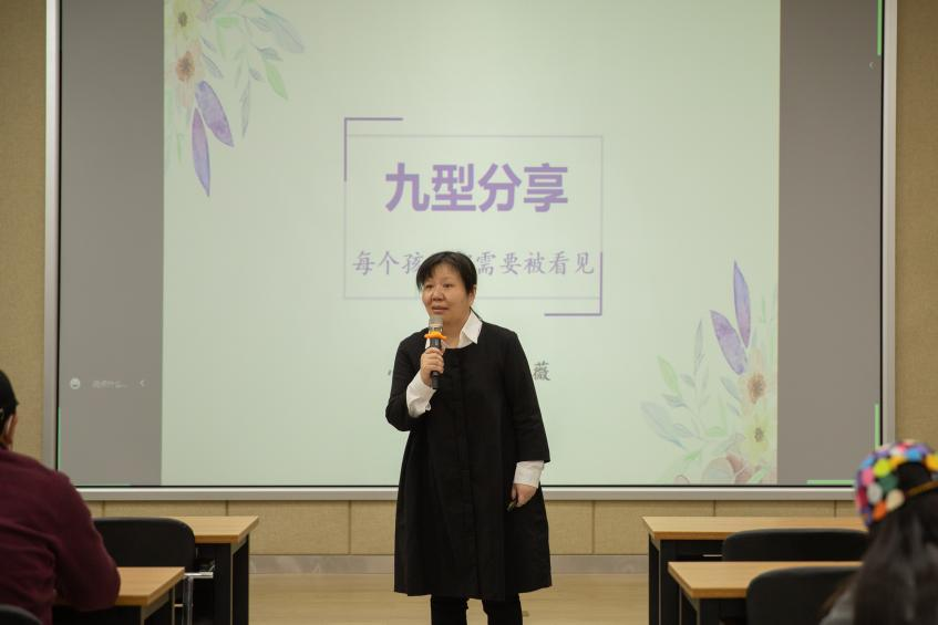 韩薇老师以“人真的有型吗?”问题引发在座师生热烈探讨,进而引出讲座主题“每个孩子都需要被看见(九型分享)”,她认为:“人是没有型的,九型只是对生命的一种假设,我们只是通过这种分类对生命、对人性进行更好的探索。每一个人的成长环境都是独一无二的,每个人也都是复杂且各自拥有一些属于自己最特殊的特质。生命并非静止的,它在成长环境中不断被改变、被塑造。”