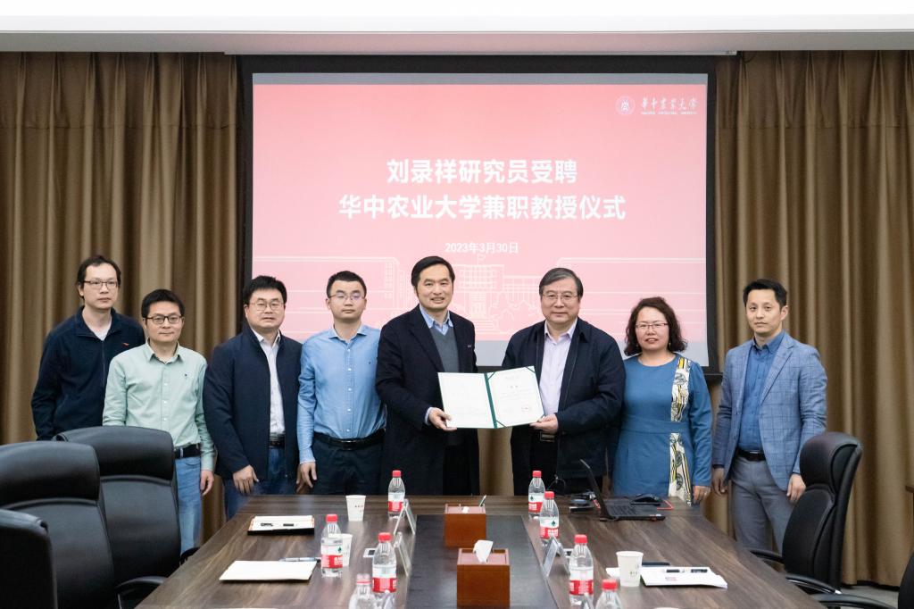 王从严代表学校感谢刘录祥老师对我校小麦团队的关心和对我校作物学科发展的支持,热烈欢迎刘老师担任我校兼职教授。他表示,学校高度重视小麦研究布局,从全球引进一批有闯劲有潜力的青年人迅速高起点组建团队,迫切需要刘老师这样的战略领军人才指导引领;聘任仪式简短而庄重,期待刘老师更多指导我校小麦团队凝练方向、谋划布局、稳健发展,希望小麦团队倍加珍惜、更加努力,用更多的科技成果和优秀人才为国家粮食安全、种业创新做贡献。学校和学院将为各位老师做好服务,为团队发展做好保障。