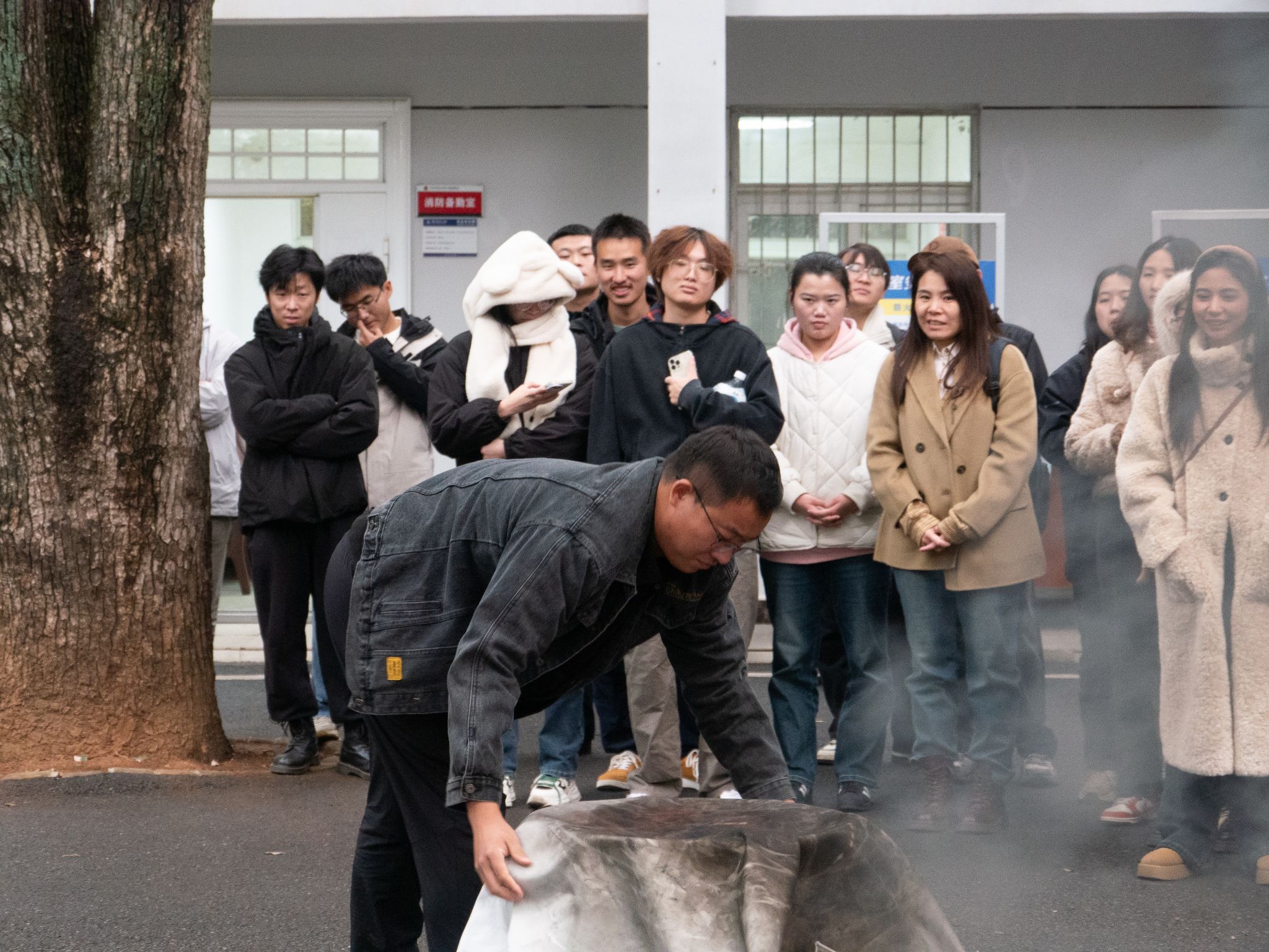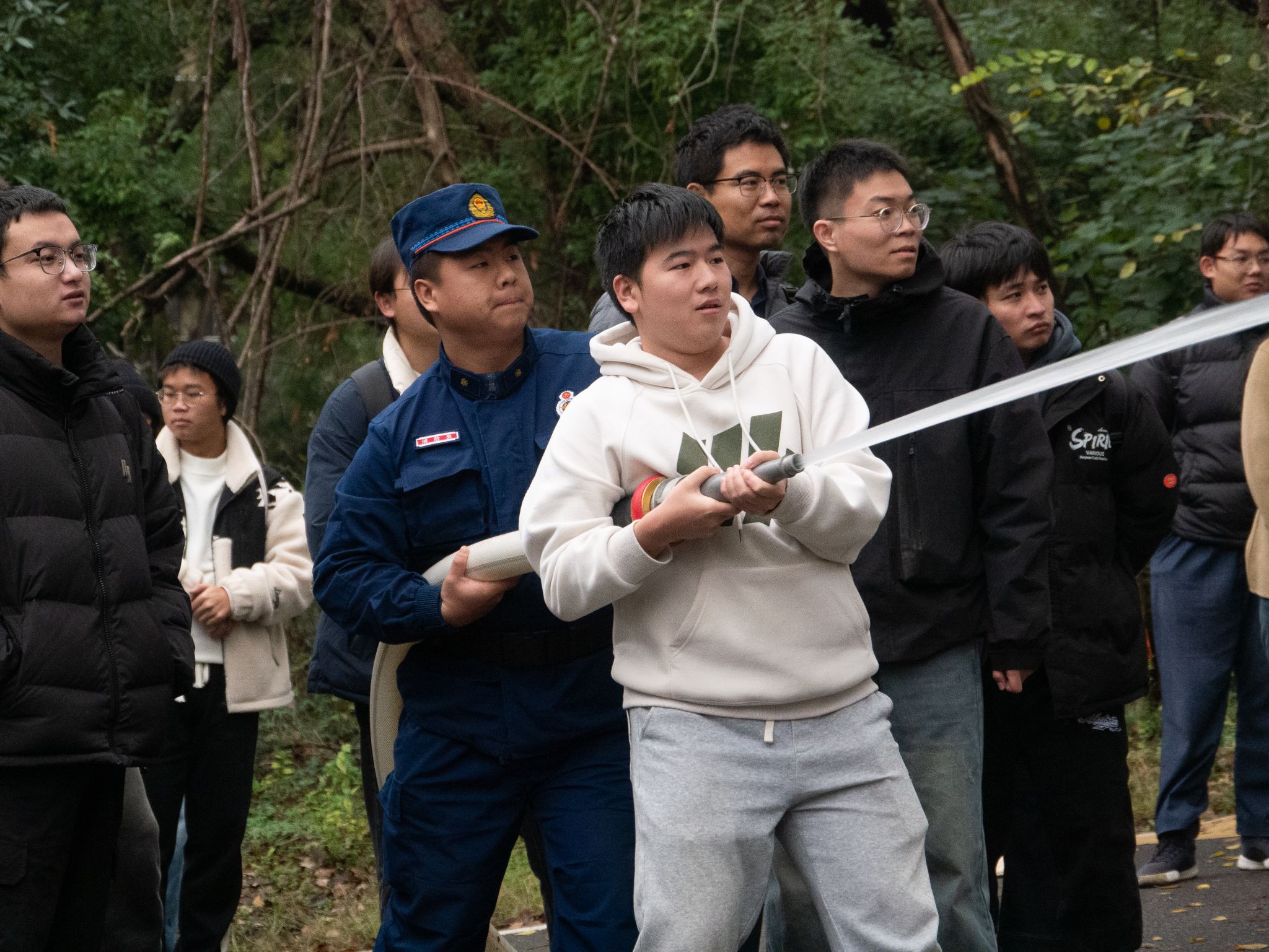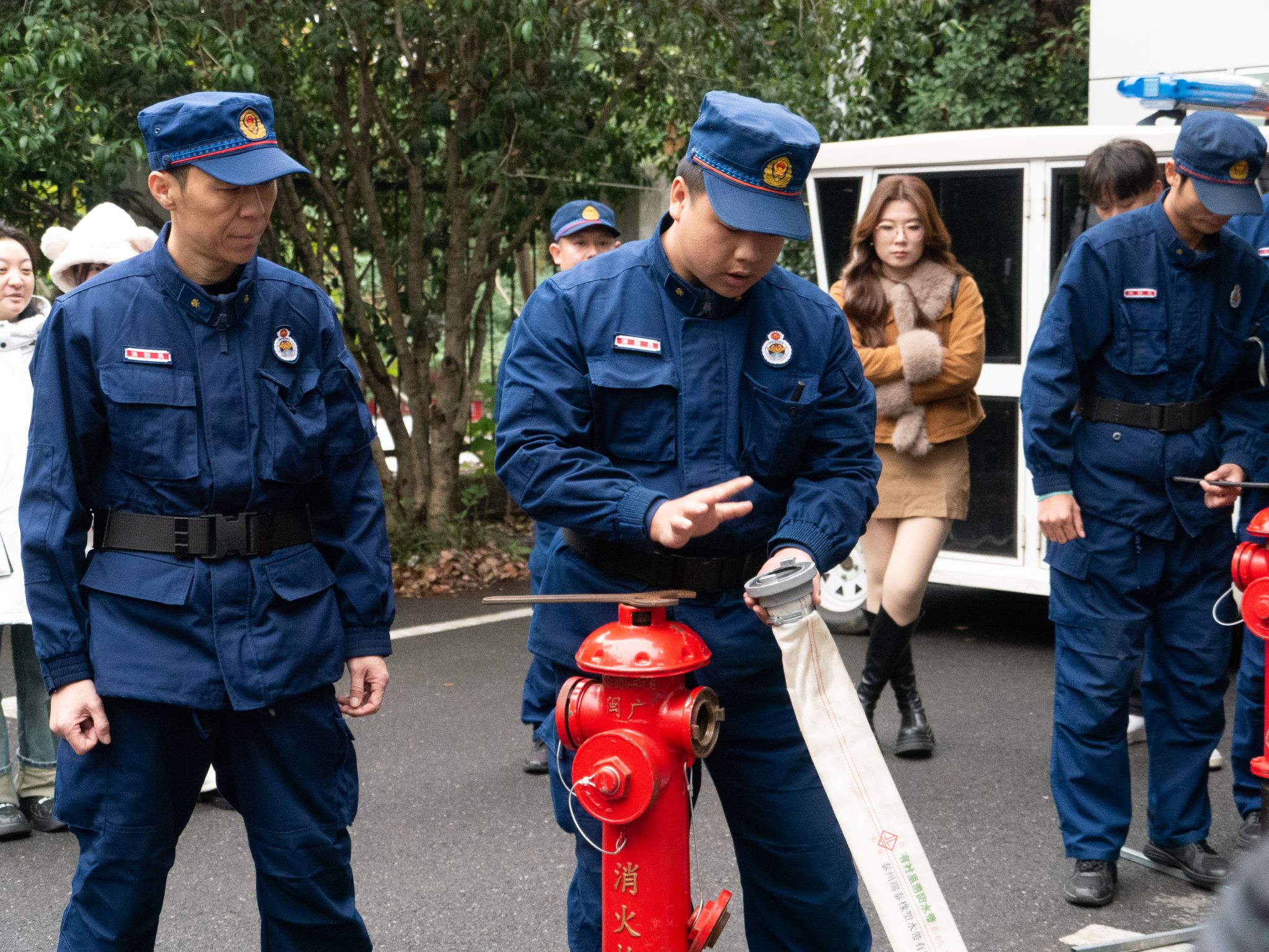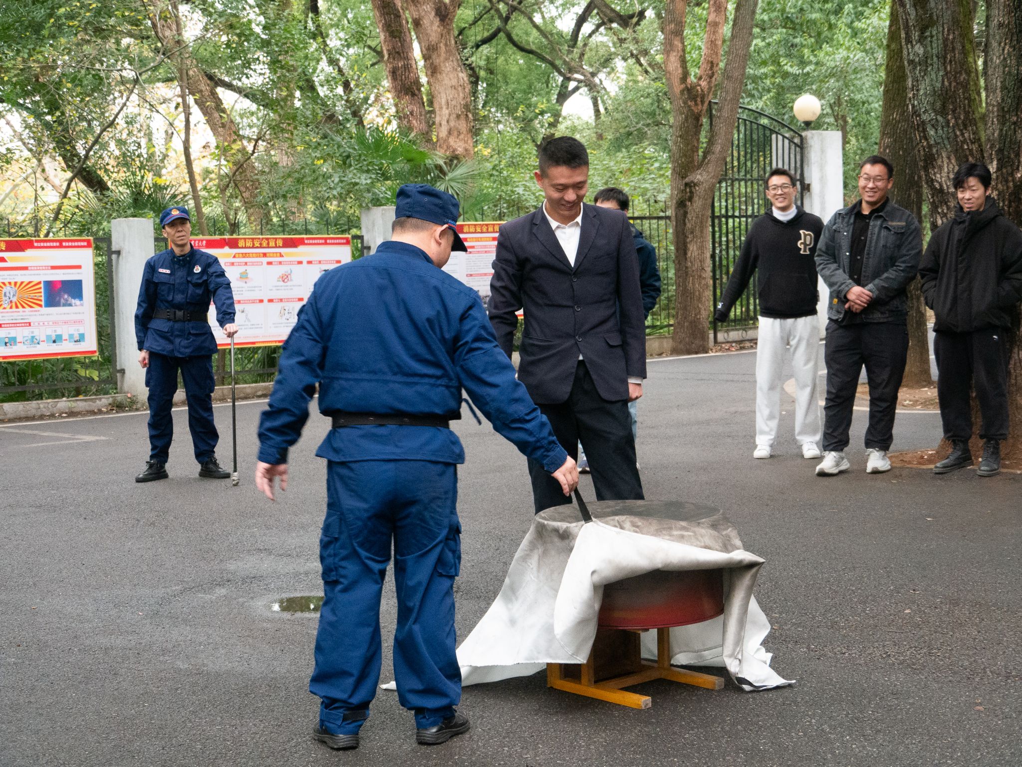 消防员讲解了灭火毯的正确使用方法,要确保灭火毯能形成一个保护屏障,完全覆盖火源,不留缝隙以隔绝空气,从而达到灭火效果。随后演练了消火栓的操作流程,包括如何开启消火栓、连接水带,以及正确喷射水枪等关键步骤,并强调需要两人协作。随后,师生们轮流进行了实操演练,通过亲身体验,大家不仅熟悉了灭火毯和消火栓的使用方法,还提升了应对火灾的实际操作能力。在演练过程中,消防员始终保持警觉,不断提醒师生注意安全,及时指导并纠正不当的灭火操作,确保整个演练过程安全高效。