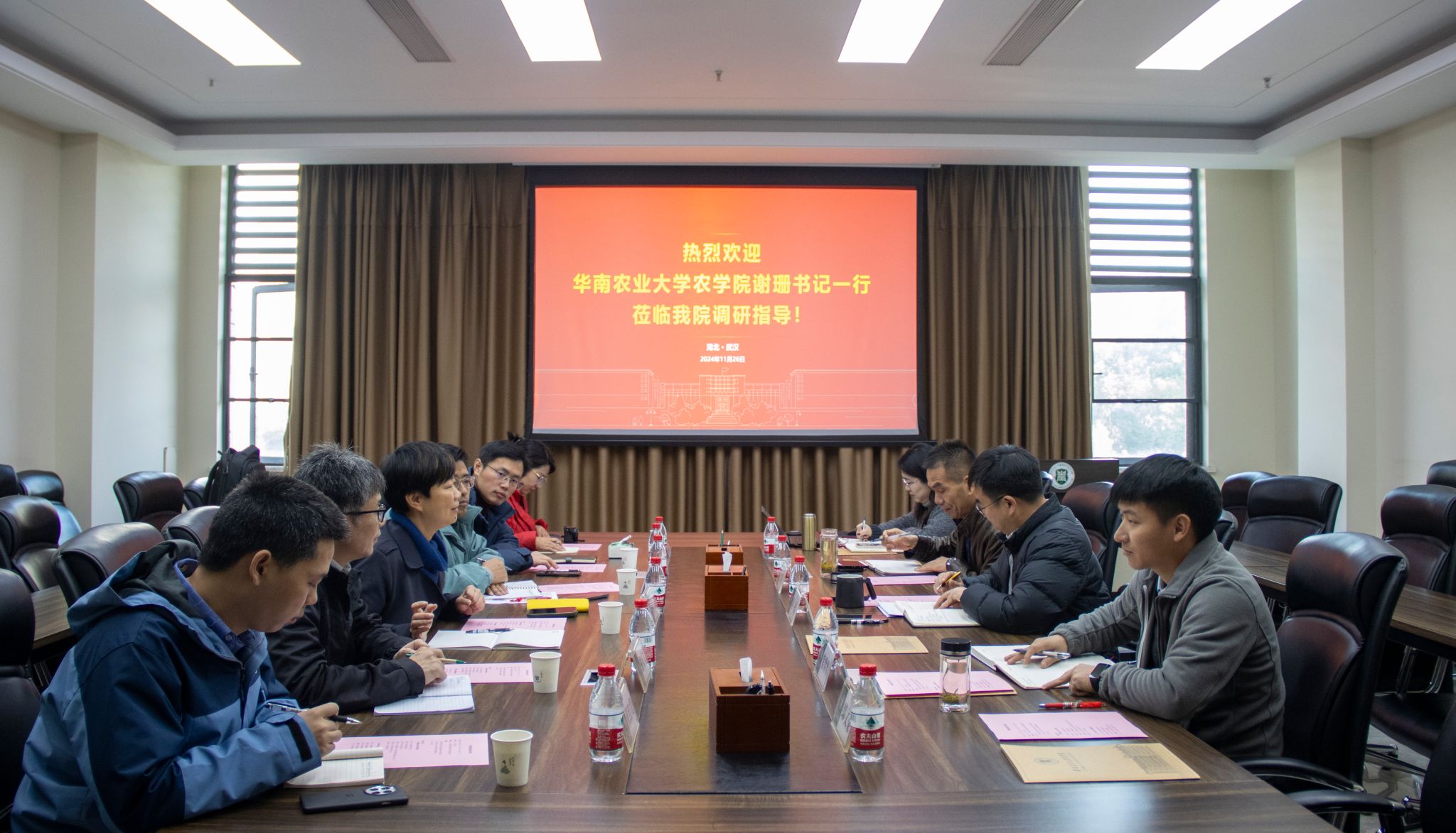 1126日上午,华南农业大学农学院党委书记谢珊一行赴我院进行调研交流,学院党委书记周雄、副院长王满囷和相关专业教师在三综B308会议室进行了座谈交流。