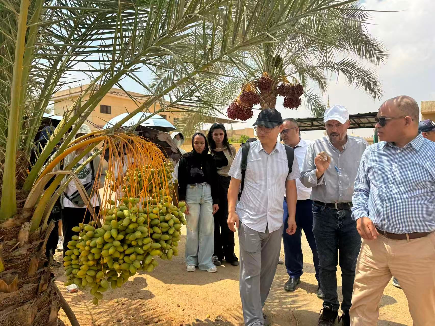 农场负责人向团队成员介绍椰枣树