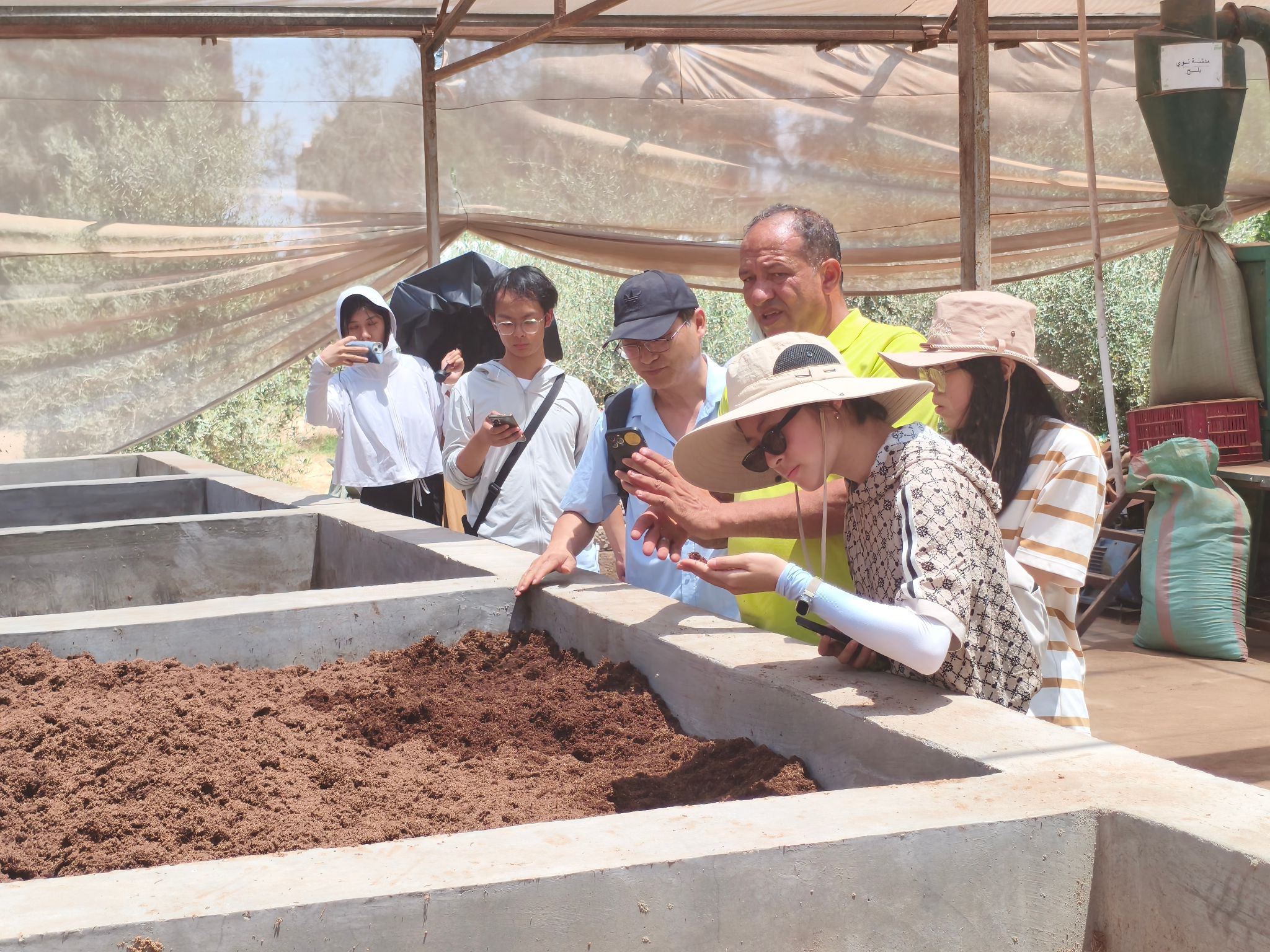 Sekem农场负责人介绍道:“从1977年一顶帐篷起步,我们现已建成占地1.6万英亩的循环农业示范基地。”该农场将椰壳粉碎作为栽培基质、将牲畜粪便转化为有机肥料的资源循环利用模式,使师生对可持续发展理念有了更为直观和深刻的认识。参观过程中,中、埃、德三方人员共同唱响经典歌曲《月亮代表我的心》,展现出跨文化互动和谐融洽的氛围。