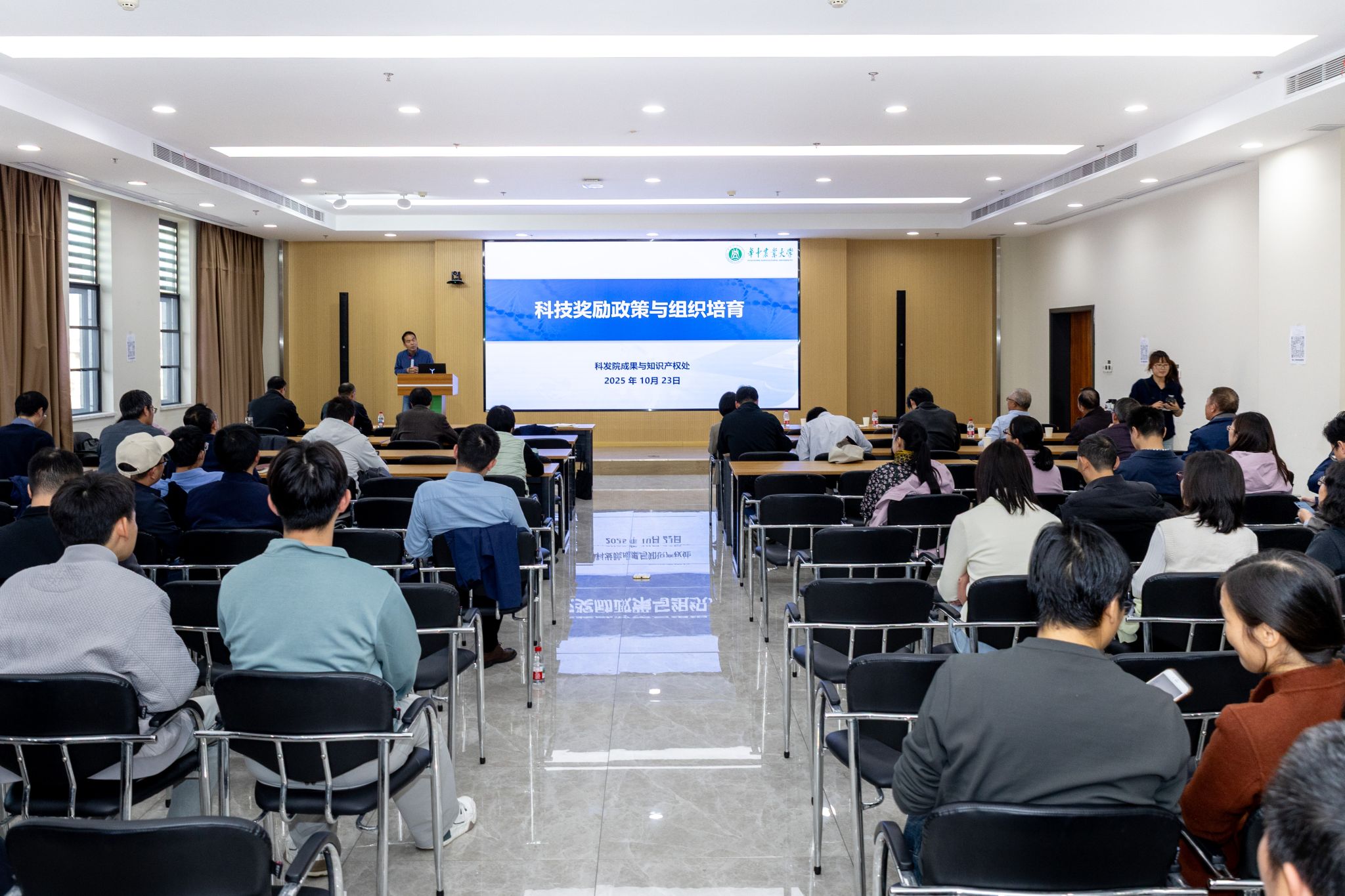 随后,科发院成果与知识产权处处长许炎生作科技奖励申报辅导报告。他深入剖析了科技奖励在人才成长与学科发展中的战略意义,强调奖项申报对教师职业发展的重要支撑作用。他指出,当前我校教师在报奖积极性,尤其是年轻教师和高层次人才的参与度上仍有提升空间,并强调报奖材料核心在于对已产出成果的提炼、总结与拔高,鼓励教师们破除“报奖复杂”“非一等奖不报”等认识误区,鼓励教师以“成果积累意识”主动参与报奖。