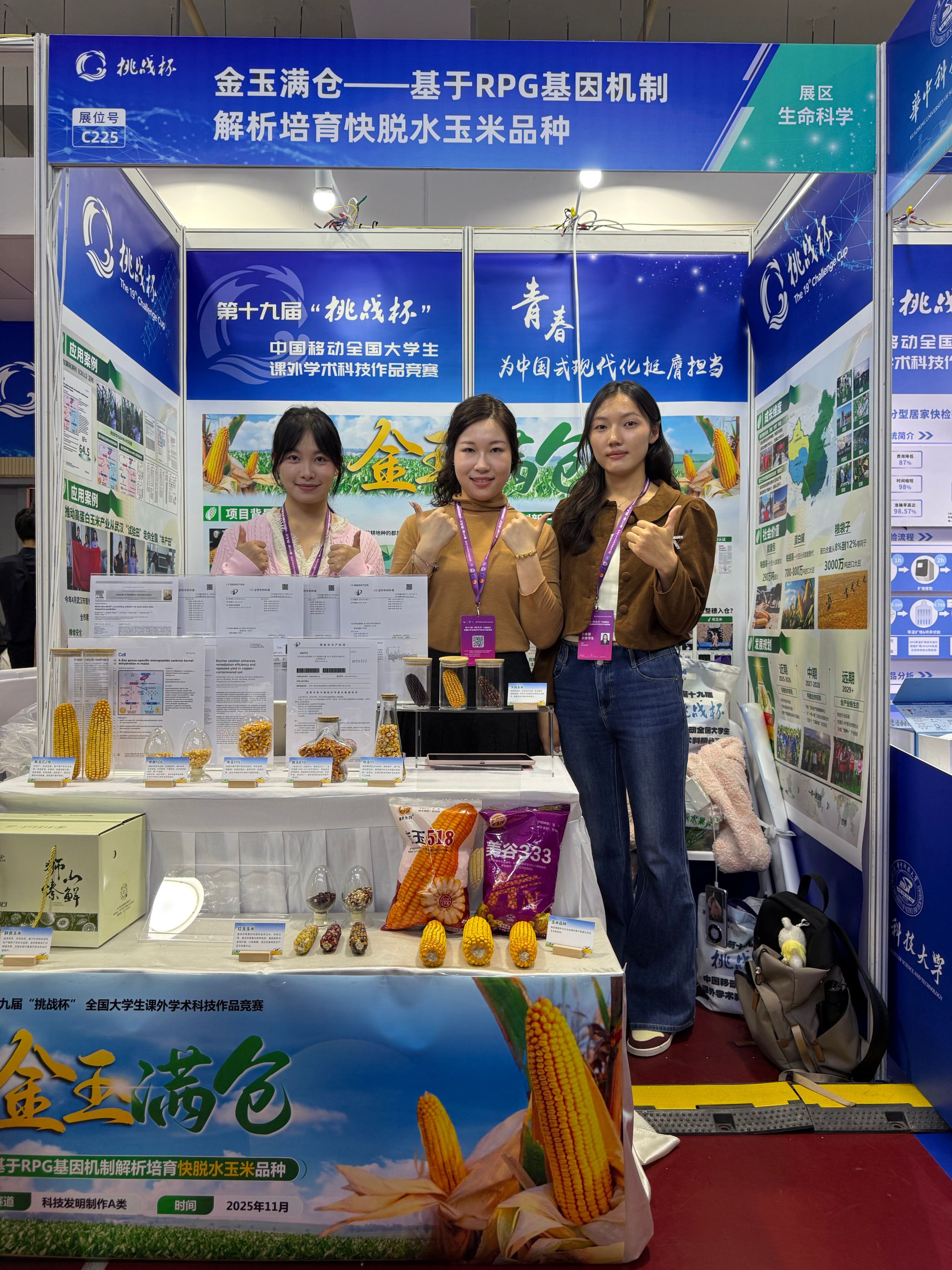 10月31日至11月4 日,第十九届"挑战杯"中国移动全国大学生课外学术科技作品竞赛决赛在南京举行。我院选送项目“金‘玉’满仓——基于RPG基因机制解析培育快脱水玉米品种”获得科技发明制作A类赛道二等奖。