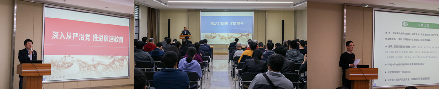 首先,院长朱龙付做了试用期述职报告。朱龙付认为,学院搬入三综以来,始终坚持内涵发展,一流人才、一流师资、一流成果产出能力进一步增强;“狮山有约”活动取得显著成效,学生进一步了解本专业和学院文化;完成学科评估工作,骨干师资建设进一步加强。朱龙付强调,未来学院要在拓展办学资源、加强校企合作上下功夫。紧接着,组织部面向参会教职工发放并回收了考核表,完成了对朱龙付同志的试用期考核。