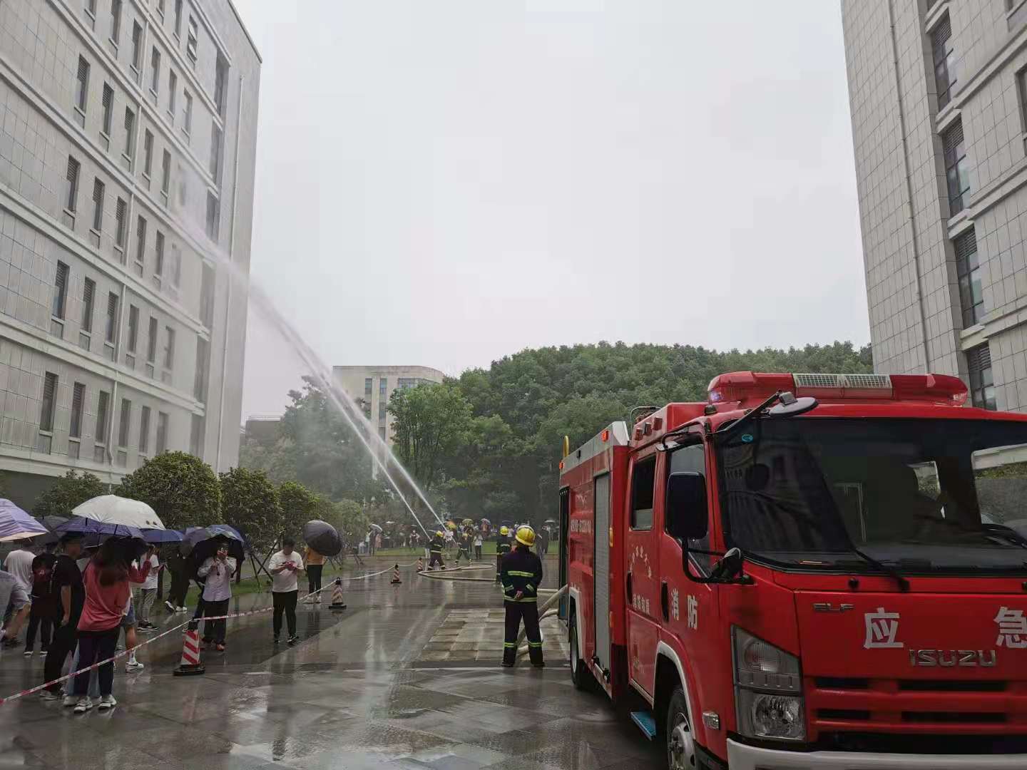 本次演习由校园建设与安全保卫部与我院共同组织实施,以第三综合楼为演习对象,全真模拟火灾现场。15时30分,预设地点起火后,弥漫的烟雾触发楼内烟雾报警器系统,学院发现火情立即启动应急预案,报校园110并通过灭火器紧急扑救,同时楼内启动消防广播系统,志愿消防队迅速分楼层疏散楼内全部师生。15时35分,楼内师生全部疏散到楼下广场,与此同时消防车已经达到起火现场,迅速展开扑救及救援行动。整个演习环节紧张、有序、高效,身临其境的师生们亲历了一场消防疏散及扑火全过程后,对消防应急处置有了更加直观、深入的认识。