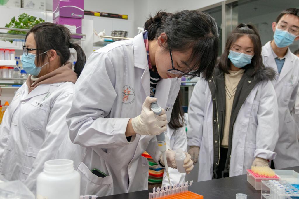 接下来,在鄢文豪的带领下,同学们参观了小麦团队的实验室。来自智农2102班的张泽雷同学感慨道:“每个实验室都具有不胜枚举的价值与意义,大饱眼福之后的我重新认识了科学的严谨与复杂性。”参观结束后,同学们三两成组,在研究生的指导下体验了提取质粒的实验操作。“提取质粒的实验操作让我深深感受到科研的严谨,每个不经意间的失误都会影响最终的结果。”来自植生2107班的赵婧同学在操作过程中感叹道。