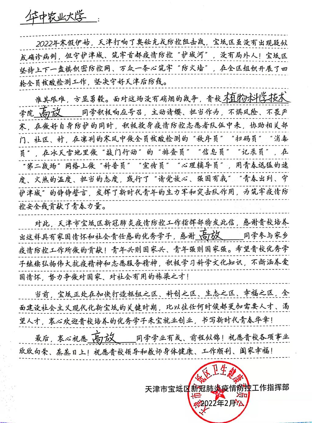 除了在交通战线上阻断疫情传播,他们也通过各种方式,以己之力,守护家乡,坚固防线。植生2106班高放在返乡之前便加入了村里疫情防控群。疫情防控期间,她不仅是冰天雪地里的“秩序员”,更是挨家挨户的“排查员”。近日,天津市宝坻区疫情防控指挥部给英国365集团大学发来感谢信,信中鼓励她继续弘扬伟大的抗疫精神和志愿服务精神,努力争做对国家、对社会有用的栋梁之才。贵州省安顺市1月27日新增一例新冠阳性病例后,政府封锁了各条出入安顺的交通通道。“收到这个消息时,我脑海里马上浮现出了一个念头——我要去做志愿者。能为家乡疫情防控做些力所能及的事,是作为一名青年学生的责任。”植生2109班罗颖动情地说。罗颖当天晚上便联系居委会的工作人员,报名了疫情防控志愿者,协助28日的全市核酸检测工作。工作中,罗颖负责核酸检测小程序的科普、居民个人信息的登记和网上录入工作。参与到自己家乡防疫工作中的,还有植生2104班黄梦璇、21级农科张之洞班马翼恬、张伟。他们坚信,尽管自己的力量微薄,但是多方联动,共克时艰,必能打赢这场持久战。
