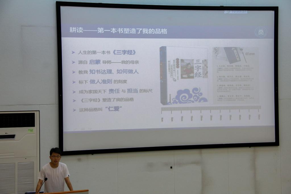 来自工学院机制1804班的吴佳瑶以“耕读不辍,书香致远”为主题展开演讲。他结合自身成长经历谈及如何践行华农校训精神,并以仁爱、自强和极致三种精神勉励自己为修身齐家而读书,以学习、读书和运动三种方式激励自己为中华复兴而读书。