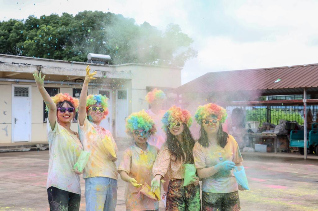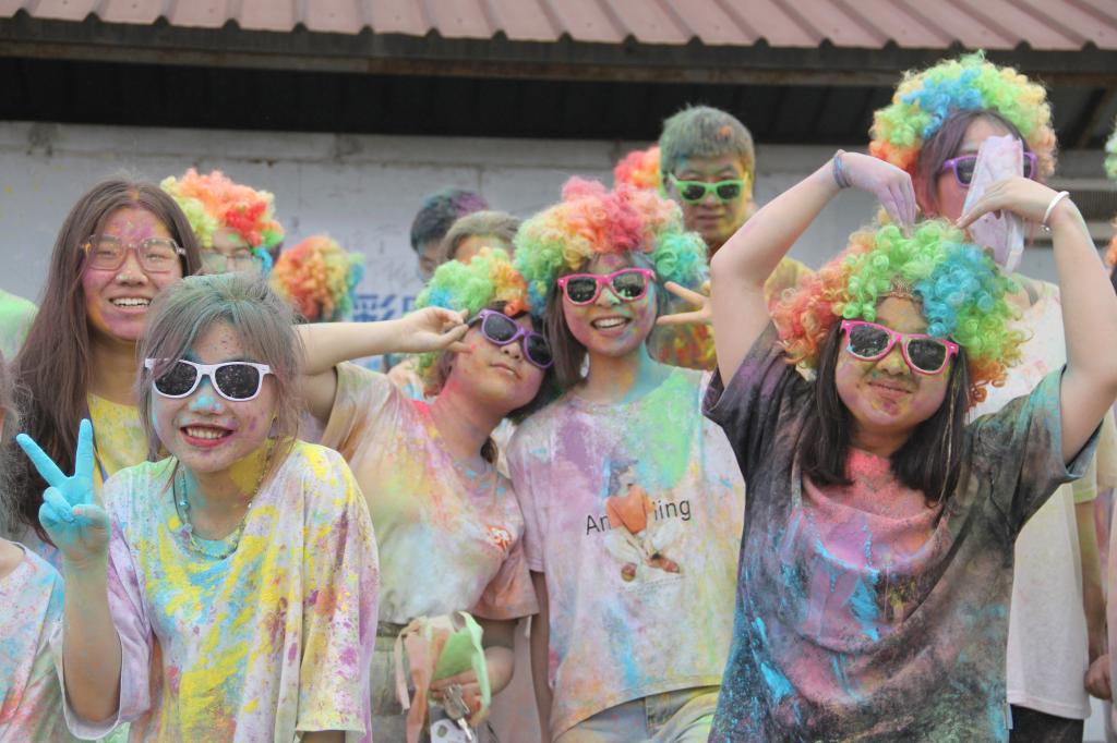 在大家到达最终点玉米基地后,主办方为所有参与者发放了彩虹粉,供大家泼洒。随着情绪的持续高涨,同学们开始肆意地挥洒着手中的彩虹粉。一时间,整个玉米基地变成了一个大型欢乐海洋,彩色的玉米粉描绘出一道道彩虹,映射在大家的身上。