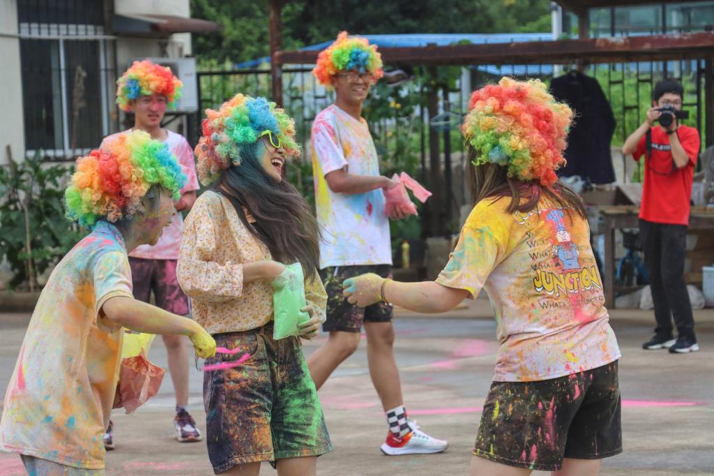 主办方在不同的基地旁设置了彩虹点,在大家经过时,会有工作人员将准备好的彩色可食用玉米淀粉撒在每个参与活动的同学身上,为他们“上色”,给予他们“彩虹的力量”,以此激励他们坚持完成五公里的挑战任务。