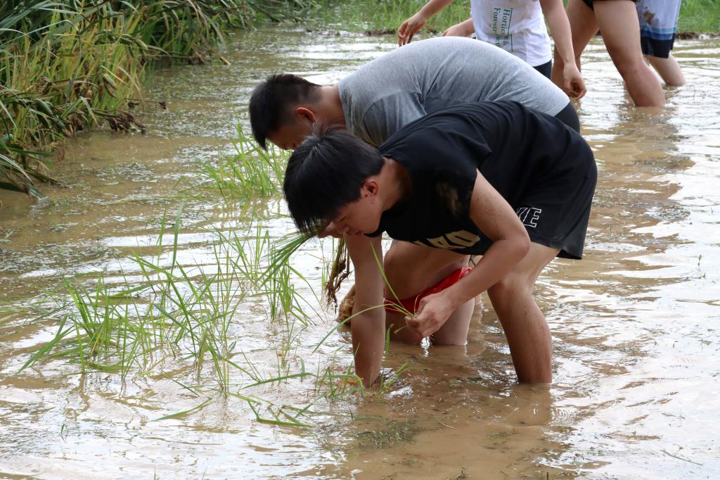 在经过短暂的休息之后,比赛进入到了最激烈的最后一轮。按照要求,各组需要全员上场,依次通过抽取6株水稻苗数其分蘖数,连续插下6根秧苗并穿越水田,一人演绎一人猜词的附加条件传递秧苗,最后他们再穿越水田回到起点。由于水田中淤泥湿滑,前进阻力大,同学们每一步都走得很艰难,但为了赢得比赛的胜利,参赛同学不由得加大步幅,加快拔腿落脚的速度,努力克服遇到的困难。同学们在积极竞赛的同时,还体验到了插秧抛秧的快乐。
