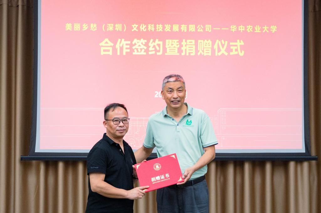 随后双方进行签约,胡浩代表美丽乡愁(深圳)文化科技发展有限公司向学校进行捐赠,院长朱龙付代表学校接受捐赠,校友办主任杨仁海为胡浩颁发捐赠证书。