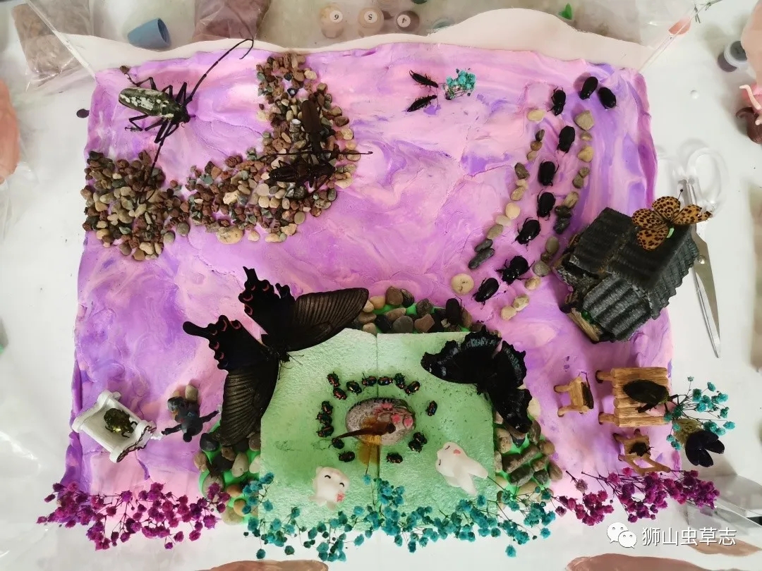 “大鹏一日同风起,扶摇直上九万里”,一等奖作品《扶摇》表现了当代青年人朝气蓬勃,奋发向上的时代精神。该作品主体为蜿蜒缠绕的藤蔓,前路漫漫、崎岖坎坷,却仍旧蜿蜒攀升、无畏巉岩,周身点缀的灯光唯美地点明了“道路是曲折地,前途是光明的”的时代命题。蜻蜓、凤蝶、眼蝶、天牛、蝼蛄等昆虫巧妙地生活在乱枝围绕中,表现了它们挺过幼虫期的强敌环伺、捱过蛹期的艰难困苦、终得一身绚烂的生命意义。《陋室筑新府,花香引蝶来》则指出了实施乡村振兴战略,是实现美丽中国梦的必然要求。左边的颓垣败瓦、破旧房屋、杂草丛生,以及在老房子中栖息的蟋蟀、蚂蚁、蝗虫等昆虫,表明了面对这样百废待兴的景象,尽管实现美丽乡村的过程中有困难、有险阻,但由破旧房屋出发的菜粉蝶向着河对岸的美丽乡村形成了“蝶桥”,代表了我们相信乡村能够走向美好,走向振兴的决心。