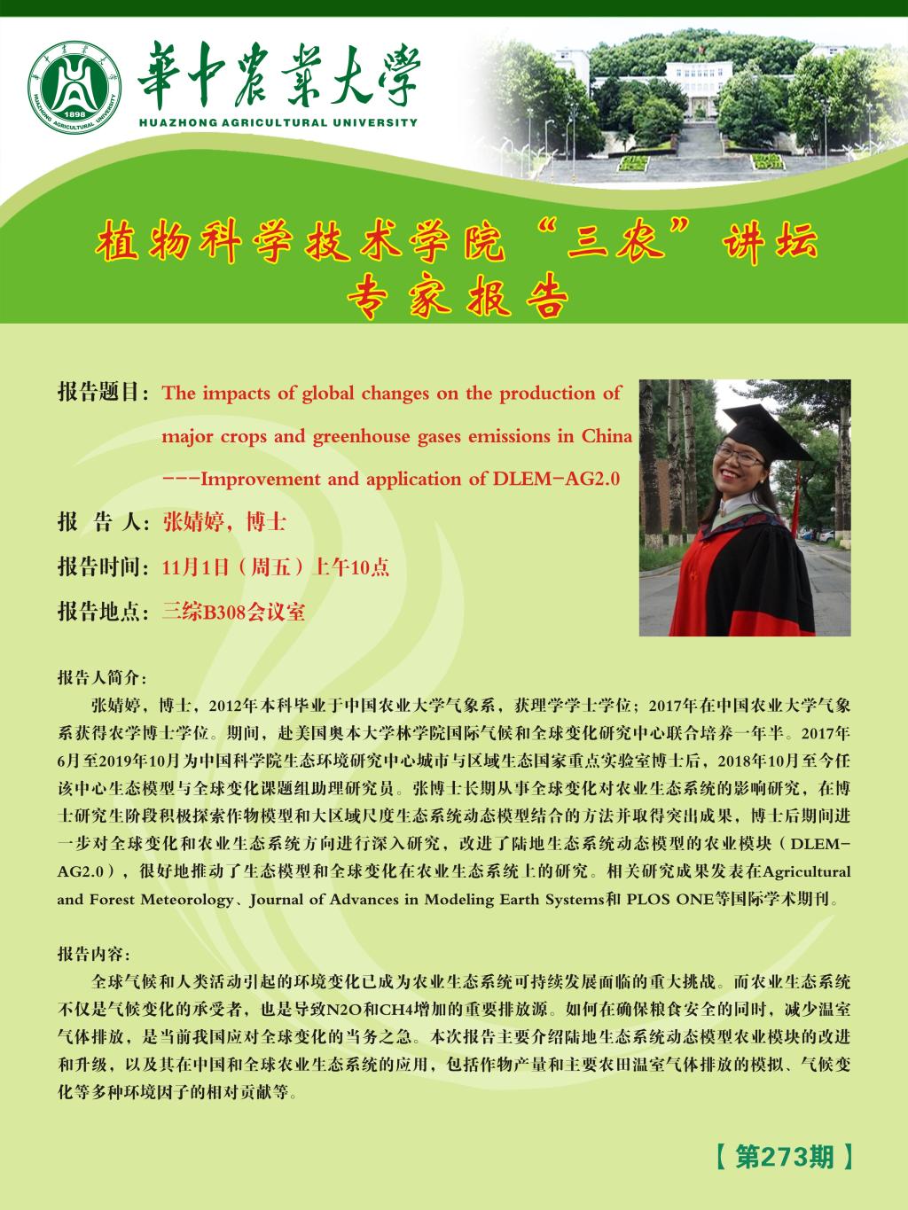 Zhang Yuting, Ph.D., graduated from the Department of Meteorology, China Agricultural University with a bachelor's degree in science in 2012. In 2017, he obtained a doctorate in agronomy from the Department of Meteorology, China Agricultural University. During the period, he went to the International Climate and Global Change Research Center of the College of Forestry, Auburn University, USA for a year and a half. From June 2017 to October 2019, he was a postdoctoral fellow in the State Key Laboratory of Urban and Regional Ecology of the Research Center for Eco-Environmental Sciences of the Chinese Academy of Sciences. Since October 2018, he has served as an assistant researcher in the ecological model and global change group of the center. Dr. Zhang has been engaged in research on the impact of global change on agro-ecosystems. He has actively explored the combination of crop models and large-area ecosystem dynamic models at the doctoral level and achieved outstanding results. She further researched on global change and the direction of agro-ecosystems during the post-doctoral period,which improved the agricultural module of the terrestrial ecosystem(DLEM-AG2.0) and promoted the research of ecological models and global changes in agro-ecosystems. Relevant research results are published in international academic journals such as Agricultural and Forest Meteorology, Journal of Advances in Modeling Earth Systems and PLOS ONE.