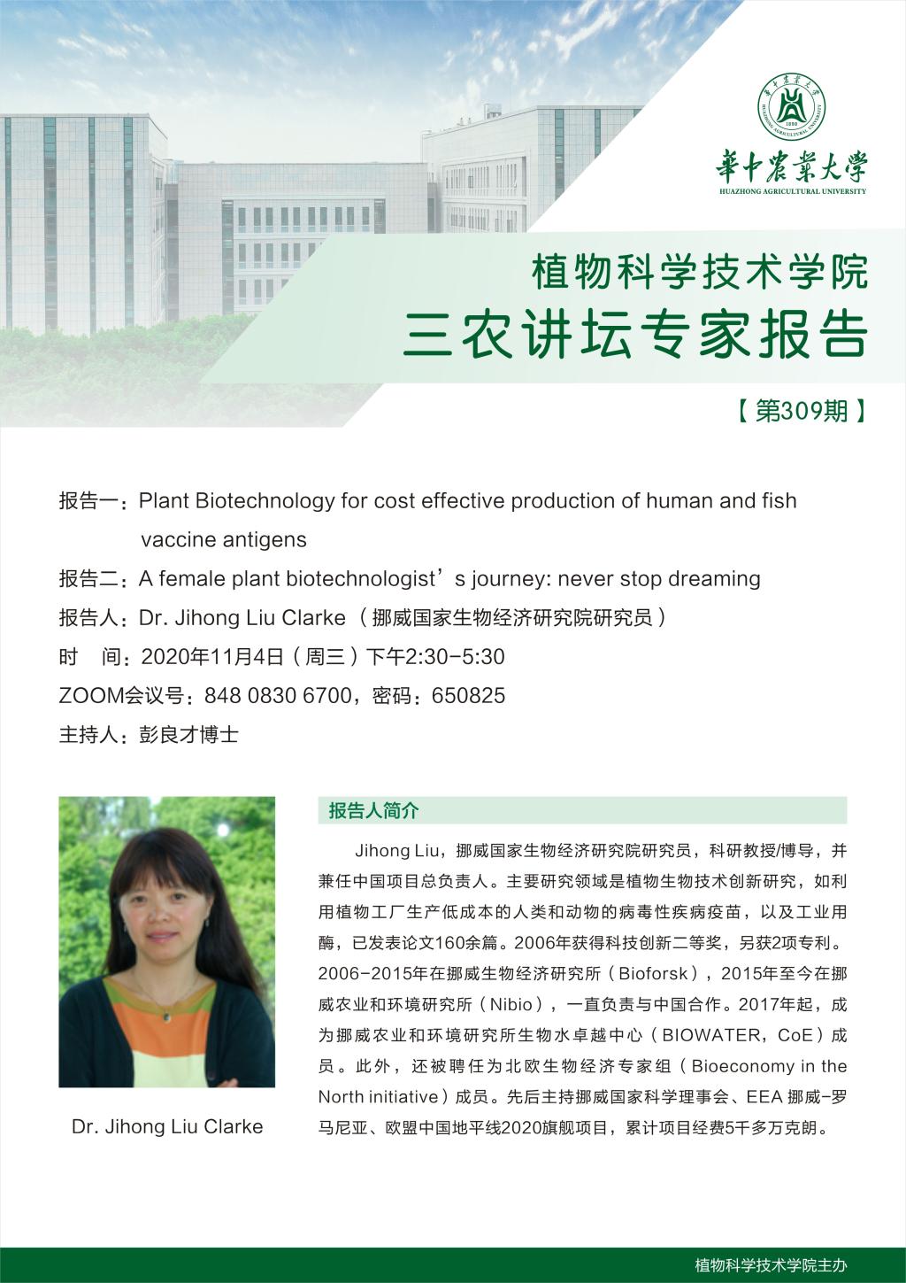 Dr. Jihong Liu Clarke is a researcher of Norwegian Institute of Bioeconomy Research, a professor of scientific research, a doctoral supervisor, and the head of Chinese projects at the same time. Her research focuses on the innovation of plant biotechnology, such as producting low-cost vaccine for human and animal’s viral diseases by plant factories and industrial enzymes. Till now, over 160 papers have been published. The second Prize of Scientific and Technological Innovation was achieved in 2006, and two patents were also gained. Dr. Jihong Liu Clarke has been responsible for working with China since she was in Norwegian Institute of Bioeconomy Research(Bioforsk)from 2006 to 2015 and in Norwegian Institute of Agriculture and Environment (Nibio) from 2015 till now. And she has become the member of BIOWATER, CoE of Nibio since 2017. Furthermore, she was appointed as a member in Bioeconomy in the North Initiative. She presided over Norwegian National Science Council, EAA Norway- Romania, and the EU-China Horizon 2020 Flagship Project successively, whose project funds added up to more than 50 million krone.