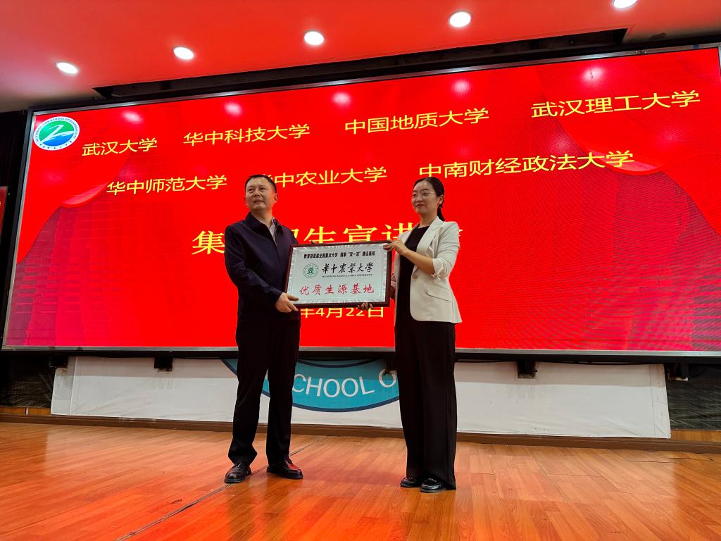 会上,学校招生办公室詹慧光面向黄石二中300余名学生介绍学校校史校情、学科特色和文化活动等。学校负责黄石招生宣传工作组与中学主要负责人、班主任开展座谈交流,介绍招生政策,并授予黄石二中“优质生源基地”。