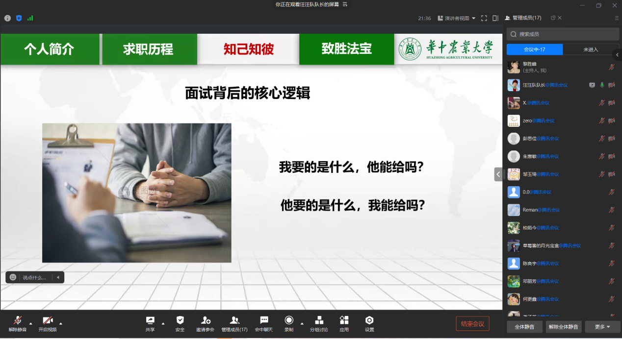 10月26日下午,第三十讲职引计划线上分享会成功举办。往届毕业生罗绍峰和邹玉琦围绕企业求职经验,分享了自身求职洞见。