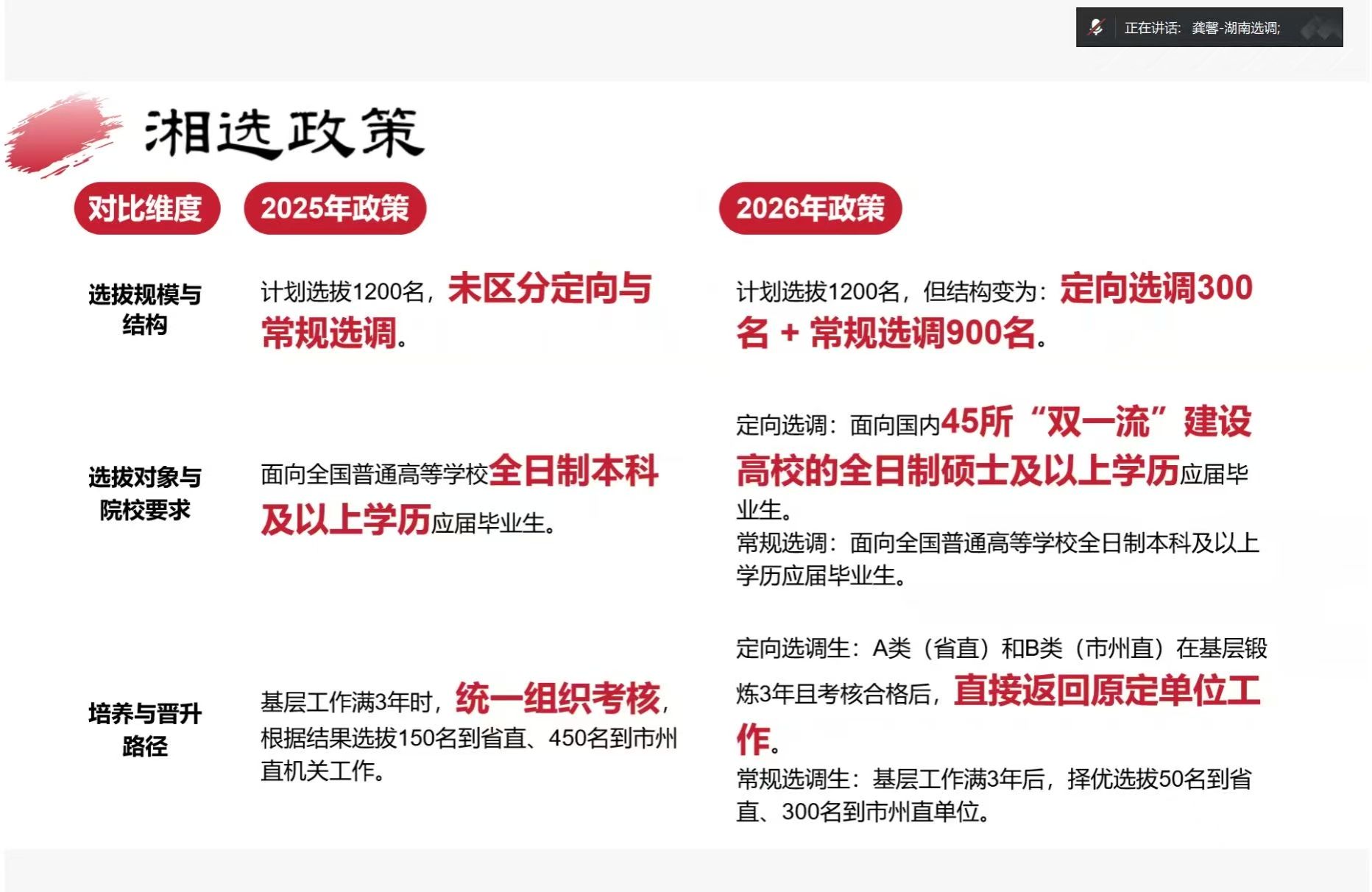唐子涵从重要考试的时间内容、复习途径与时间规划、应试注意事项等方面展开,强调选考信息、系统复习及应试细节的重要性;安家祥结合个人备考经历,从选岗、应试技巧到笔面试历程等方面完整介绍备考流程,着重分享了自我认知、科学备考及大胆尝试的心态;龚馨则从自身经历出发,简述了自己职业选择的心路历程,而后从相关政策、备考题型、基层工作等方面介绍了湖南选调的系列要点,并分享了自身的感受与备考建议。