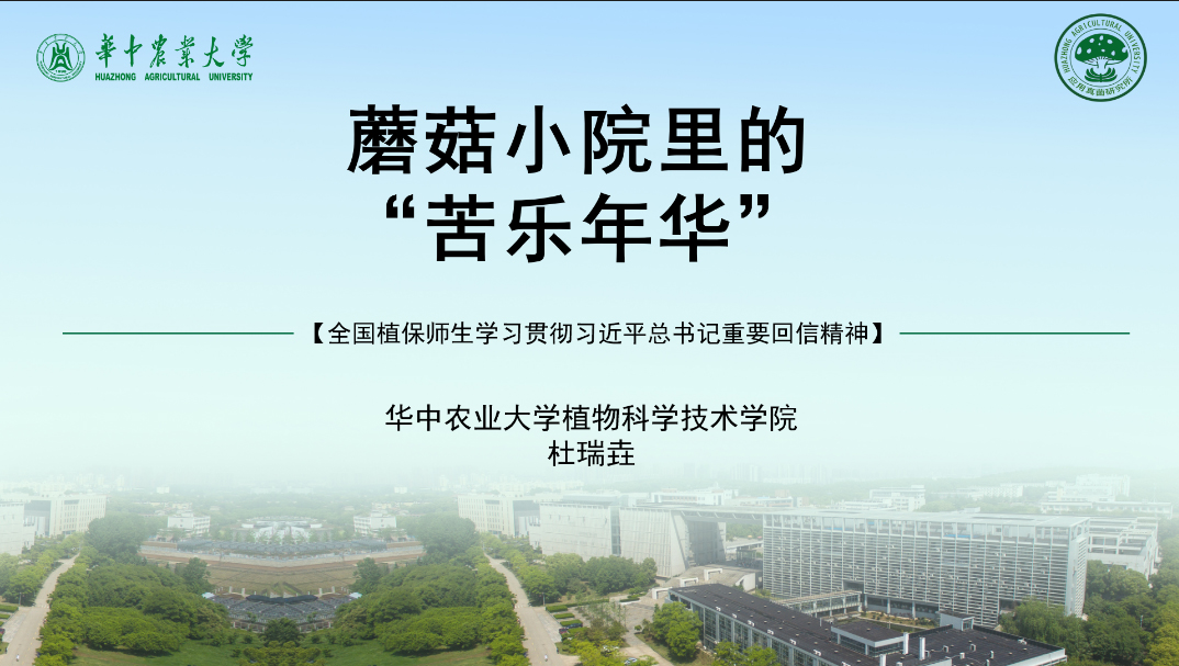 5月7日,全国近百所植保相关院校师生共同开展学习贯彻习近平总书记给中国农业大学科技小院的同学们回信精神的主题教育活动,大会以“生逢伟大时代、勇当强农先锋”为主题,我校应用真菌专业研究生党支部书记、“湖北随县食用菌科技小院”学生负责人杜瑞垚面向全国植保师生讲述他的“蘑菇小院里的‘苦乐年华’”。