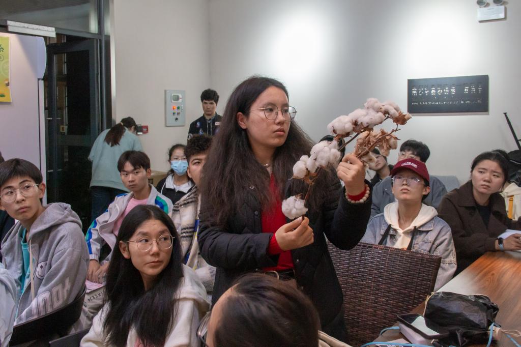 “顽强是棉花刻入基因的性格,棉花如何在逆境中生长,又如何变得更加顽强?”杨细燕开始向同学们介绍。她首先拿出了两种棉花,让大家“找不同”。棉花颜色,朵数,花朵瓣数不同手感也有不同”同学们踊跃回答杨细燕借此“棕色棉”为例向大家介绍了彩色棉与传统棉花的区别分享棉花在人们生活中的应用实例