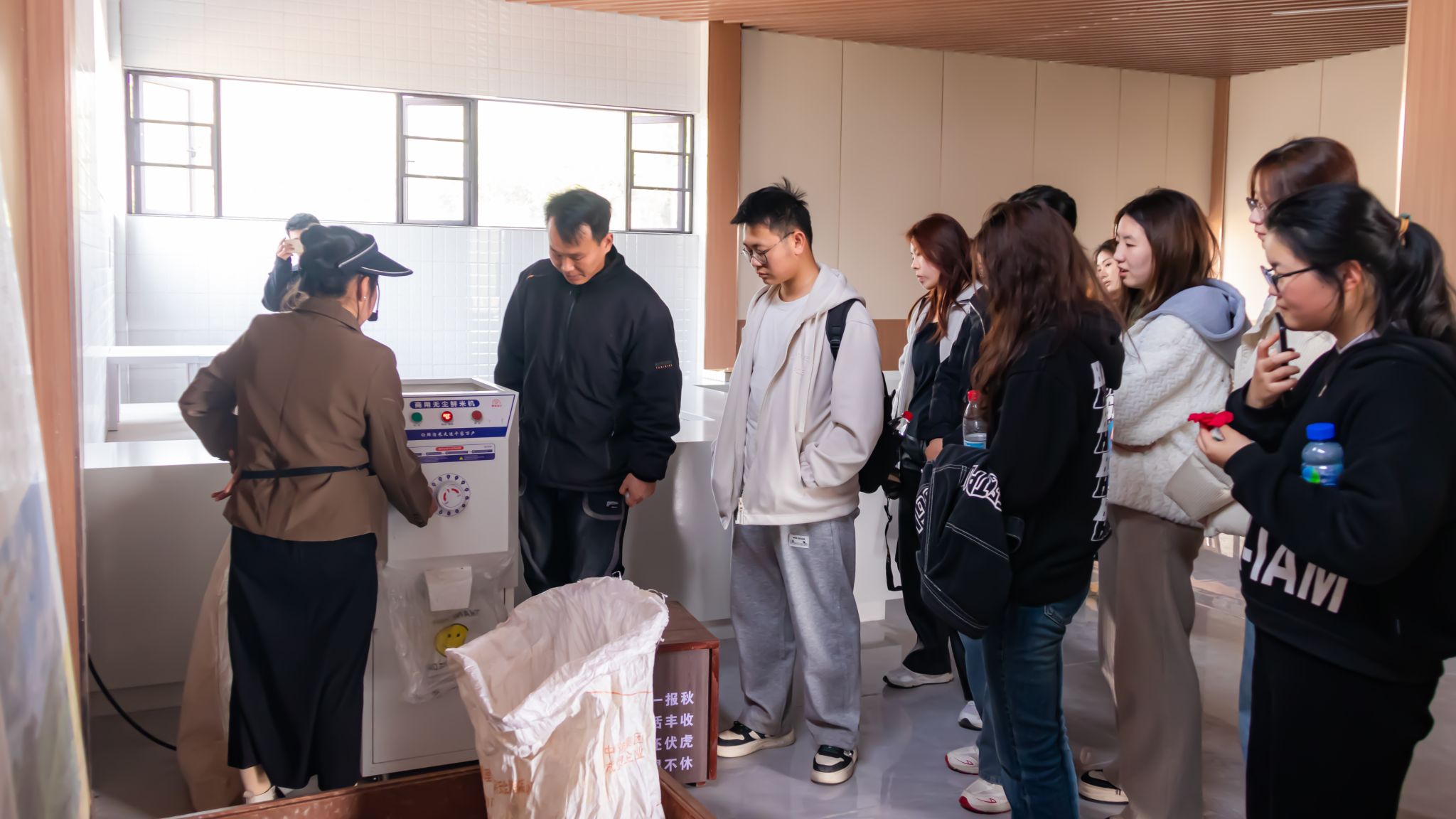 在农场负责人的带领下,师生们首先来到传统农田耕作示范区。同学们挽起裤腿,手握木犁,在讲解员指导下,一人推犁,两人拉绳,体验传统耕作方式。"看似简单的木犁,操作起来需要巧劲和耐力,我感受到了传统耕作方式的不易"智农2304班的劳玉鑫感慨道。随后,师生走访参观农场水韵书吧、耕读学堂、稻田米铺等地,体验了古法磨豆浆、古法造纸、活字印刷等特色项目,农场集种养、游乐、休闲为一体的经营模式让同学们大开眼界。