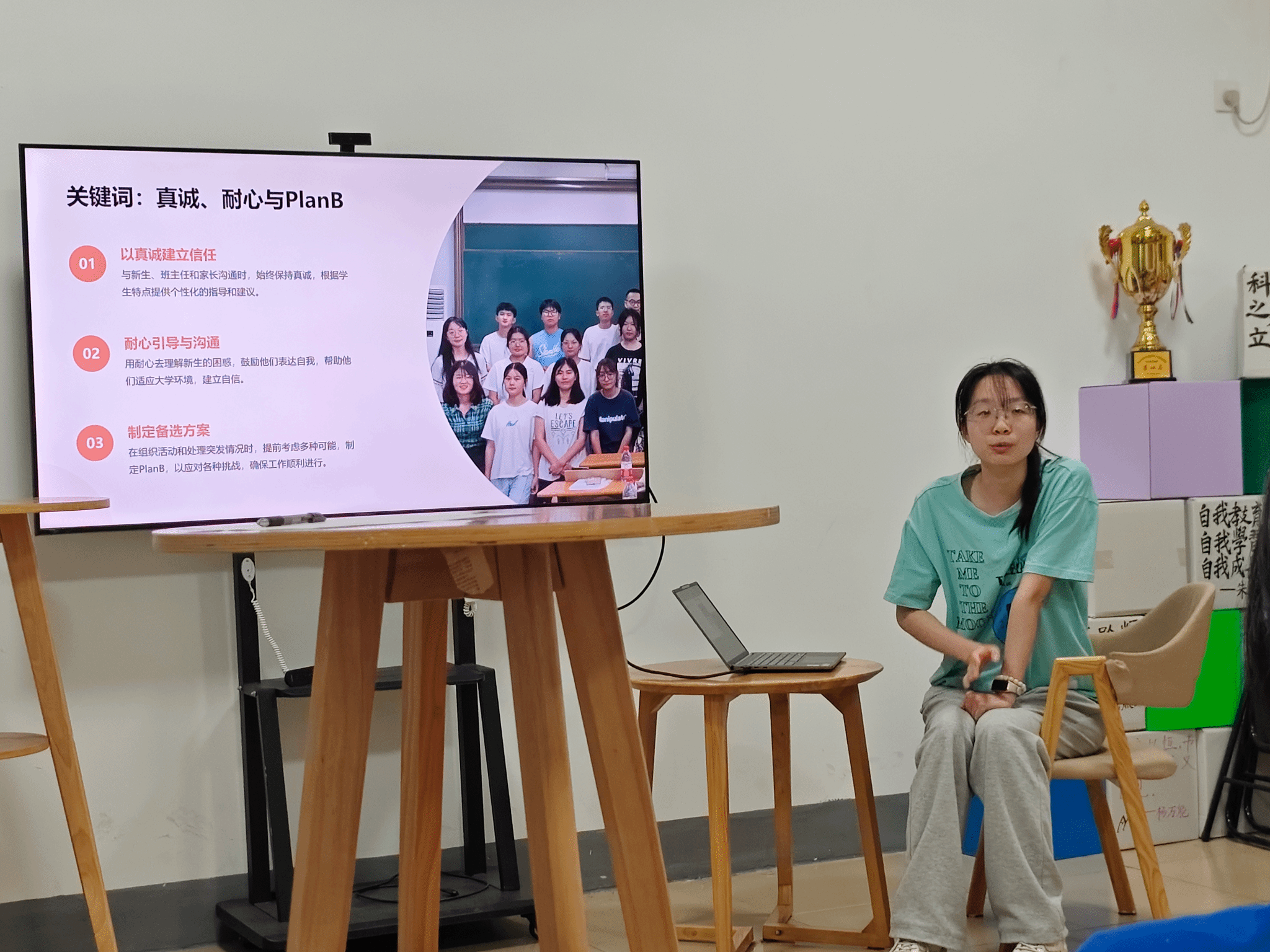 接下来,刘一鸣从9月“开学初期的管理”、10月“班级观察者阶段”和11月“期中考试后的管理”这三个阶段详细向同学们介绍了学生班主任助理的具体工作和工作重点。除此之外,她强调了“真诚”“耐心”和“Plan B”三个工作关键词, “以真诚建立信任—耐心引导与沟通—制定备选方案”,扎实做好英国365。