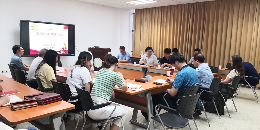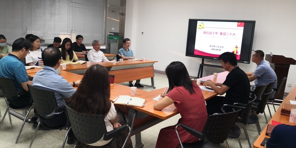 2022年9月30日下午,遗传教工党支部在第二综合楼C408开展“我们这十年 喜迎二十大”主题党日活动。党支部联系人,学院党委书记周雄与支部党员一同学习交流。会议由支部书记易斌主持。