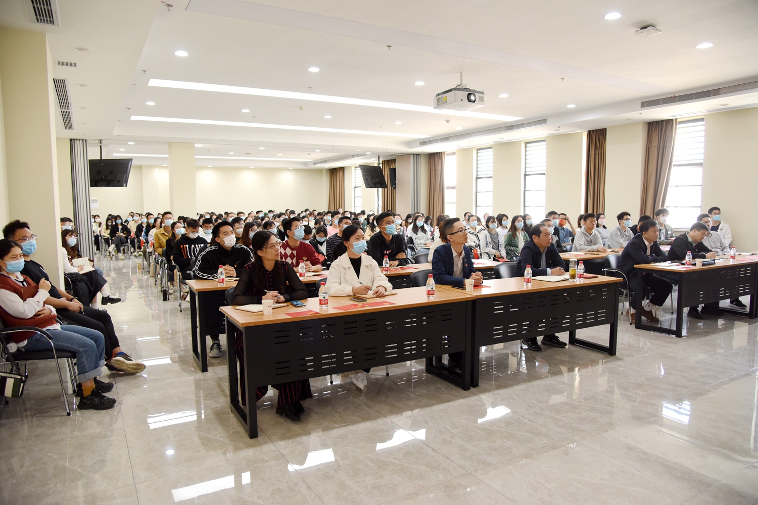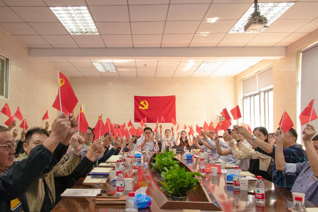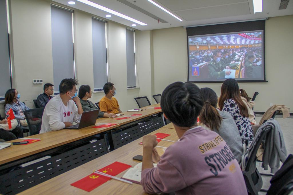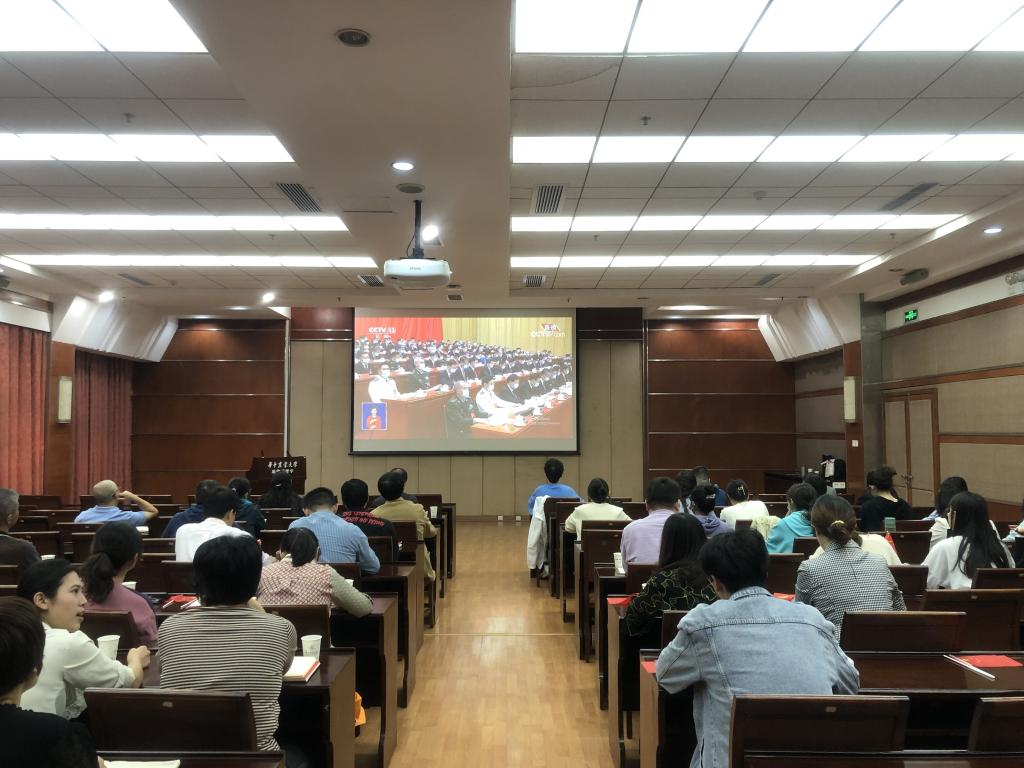 学院教工、学生和离退休党支部师生通过线上线下在9个会场同步收看大会直播,校党委副书记、副校长姚江林在三综A705主会场和师生代表一同观看了开幕式。
