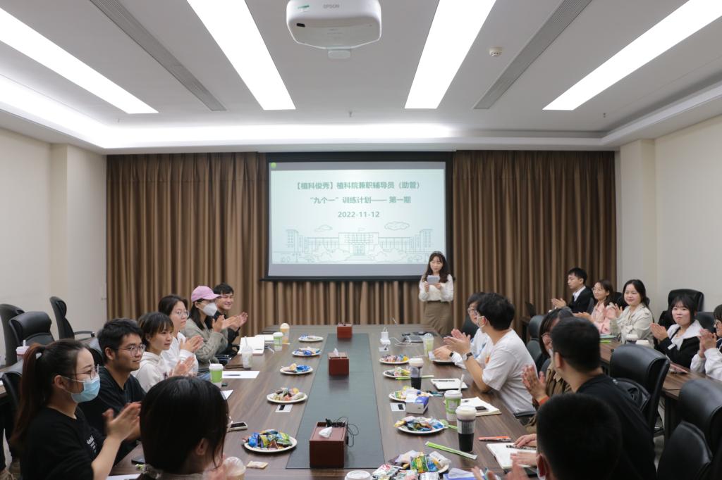 11月12日中午,植科院兼职辅导员(助管)“九个一”训练营第一期于三综B308顺利举行。生科院辅导员谈燕,信息学院辅导员苗壮,植科院辅导员熊攀攀、任伟、于姝宁及各院学生骨干代表参与此次培训。