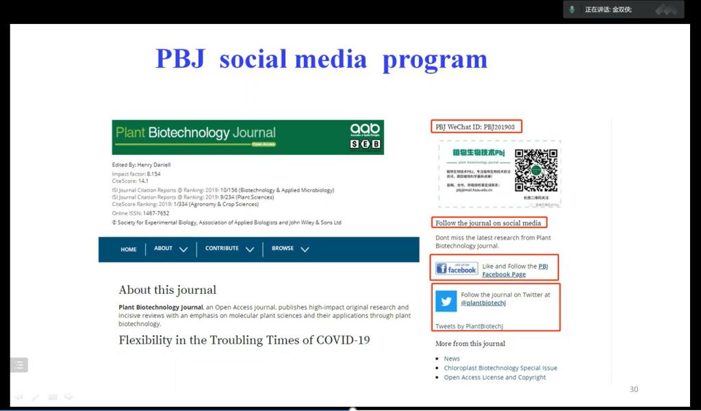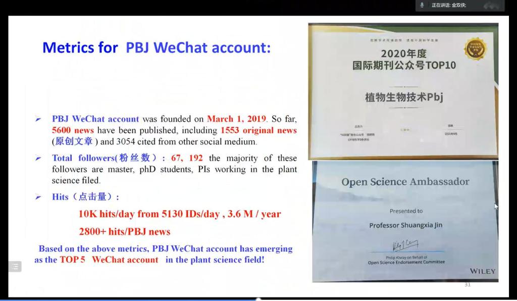 作为学术期刊《Plant Biotechnology Journa》的主编,金双侠深刻认识到学术平台对于科技创新的重要性。他从自身的经历入手为大家分析了占领学术平台的重要性,他指出,《PBJ》作为植物生物技术杂志,旨在发表应用植物科学领域领先研究人员的高影响力原创性研究,而在创刊初期,中国学者的科研成果却在杂志内容中占比很少,“主要原因在于中国编辑少、审核门槛较高”。针对这一限制因素,金双侠积极邀请中国专家参与编辑审稿,并创新期刊发布形式,创建微信公众号拓宽传播面积、提高杂志影响力。他强调,“努力利用社交媒体及国际学术期刊增加科技成果的发表与展示,能够有效提升中国学者的话语权。”