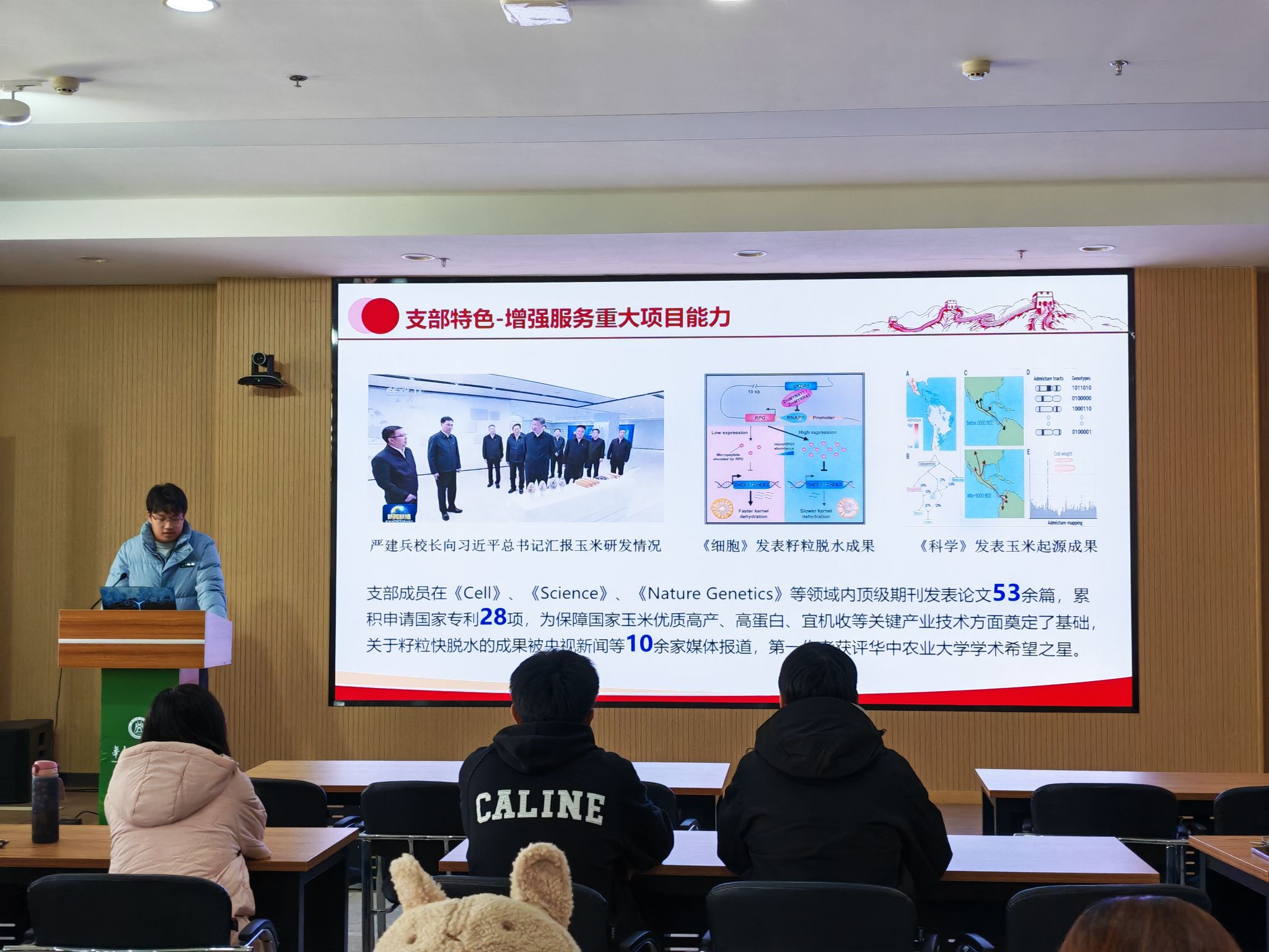 作物遗传育种专业研究生第五党支部书记吴成秀就支部服务国家重大战略需求的实践成效作了交流分享。他表示,支部始终聚焦玉米种业创新关键问题,以“挑起粮食安全‘扁担’”为使命担当,在科研攻关方面取得系列突破,多项成果发表于高水平学术期刊,相关进展获央视等主流媒体关注报道,以实际行动为筑牢国家粮食安全屏障贡献了智慧与力量。