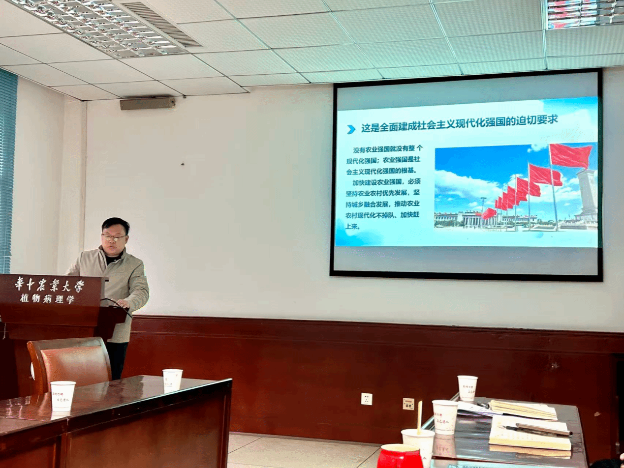 2025年12月4日下午,植物病理教研室教工第一党支部和第二党支部在分子楼116会议室开展“精读精讲”学习活动。我校“精读精讲”宣讲团成员、马克思主义学院副教授唐尚书应邀作了题为“农业历史文化视阈下的乡村振兴”的专题报告。会议由第一党支部书记谢甲涛主持,学院党委书记周雄出席会议,教研室全体专任教师参加。